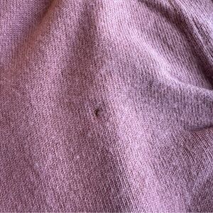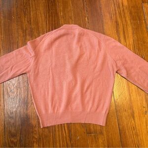 Super soft cashmere sweater with V-neckline and adorable tie detail. Beautiful dusty rose pink color, should sit at or just above waist, three quarter sleeves with a loose fit. One very small hole as shown, and some the stitching keeping the tie crossover is loose. Generally good vintage condition. Very comfy.