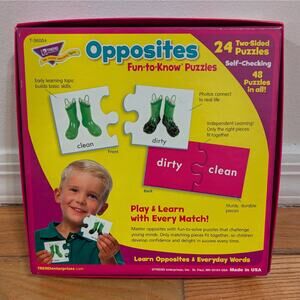 Opposites puzzle set with 24 self-checking puzzles (48 pieces in total) to help kids learn opposites and position words.