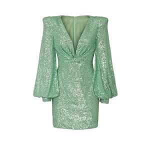 Light green sequins (100% Polyester). Sheath. V-neck. Long sleeves. Back zipper clousre. 32.5" from shoulder to hemline. Imported.