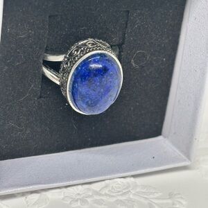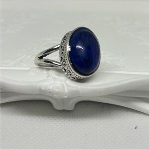 Lovely dark Lapis Lazuli set in detailed silver tone band. Oval stone is about 3/4” long so it’s definitely a statement or cocktail ring. Lapis lazuli is perhaps the most used stone for the throat chakra. I wear it to enhance my communication daily. Approx size 9.