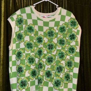 Charming pink sweatshirt adorned with sparkling red bows. Adds a fun flair to your wardrobe. Bows faded.