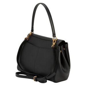 detachable adjustable shoulder strap with buckle, top carry handle, expandable accordion sides, brass tone hardware, 2 compartment design, metal feet