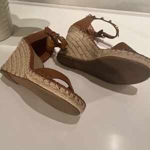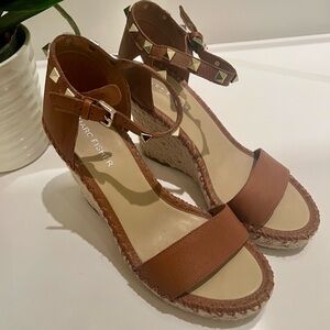 Chic Marc Fisher wedges with stud accents. Tan leather straps. Comfortable and stylish for any outing.