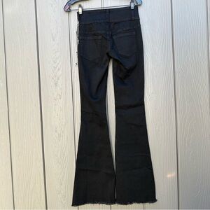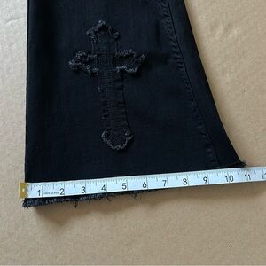 Channel a higher power in these black flare pants! They have a low rise fit and feature frayed cross patches down the legs. Comes with a detachable side chain and cross charms. Complete with front and back pockets