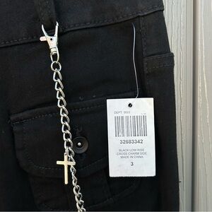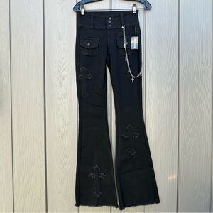 NWT Hot Topic Black Cross Patch Side Chain Flare Pants Size 3 Low Rise Gothic Stretchy Pants