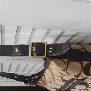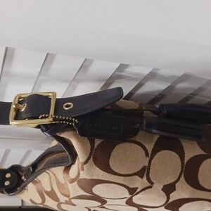 Stylish Coach shoulder bag canvas & Leather signature pattern. Rich brown leather accents. Perfect for everyday.