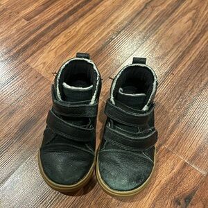 Cozy black leather and suede boots with easy velcro closure. Ideal for kids' adventures and cold weather. Great winter boot.
