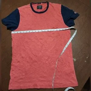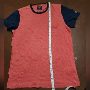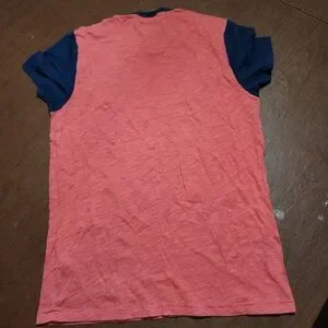Casual short sleeve tee shirt with coral body and navy sleeves. Ideal for everyday wear.
