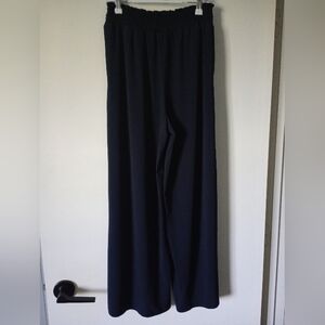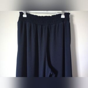 Elevate your style with these chic navy wide-leg pants. Perfect for any occasion, these pants offer comfort and elegance. They feature an elastic waistband with drawstring and are soft and flowy. Made from polyester and elastane. They are in very good gently used condition and come from a non-smoking home.