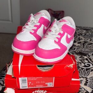 Vibrant fuchsia sweatshirt and sweatpants with bold logo design. Ideal for casual wear.
