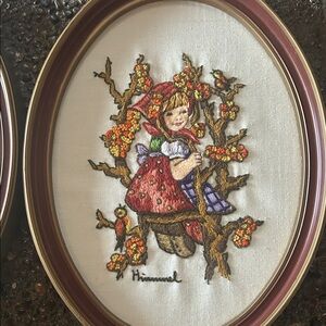 Charming vintage embroidered wall art featuring children in nature. Perfect for adding a nostalgic touch to any room. Crewel, mcm retro decor.