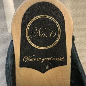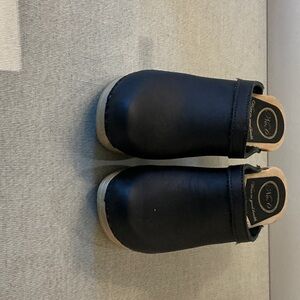 Timeless No.6 clog mules in black leather with a natural wooden sole and chunky heel. Easy slip-on style with minimalist Scandinavian design. Handmade in the USA, known for comfort and durability. A versatile year-round shoe, pairs perfectly with jeans, dresses, or skirts. Gently Used Condition