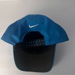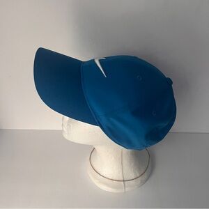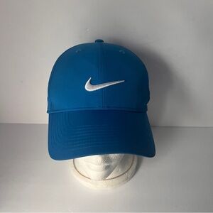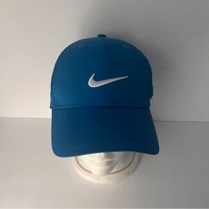 Classic blue Nike cap with iconic white swoosh. Ideal for everyday style.Made with Nike’s Dri-fit technology to wick away sweat.Adjustable back strap for a personalized fit,typically with a buckle or velcro strap.Embroidered swoosh on front and back.In great shape never been worn!