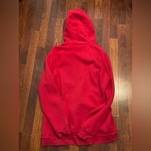Jordan by Nike men’s hoodie in size Large. Red pullover hoodie with white Jumpman Air logo on chest, front kangaroo pocket, and drawstring hood. Made from soft fleece fabric for warmth and comfort.