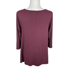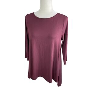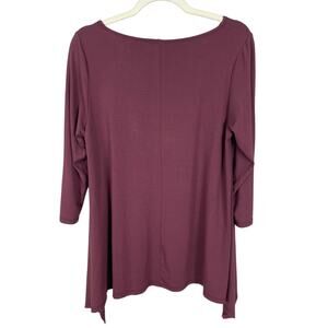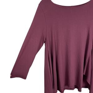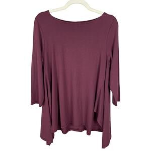 Lise Bayne jersey knit tunic top with asymmetric hem, 3/4 sleeves. Dark purple plum color. Size small. Please see photos for measurements.