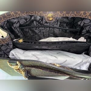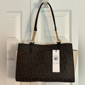 Chic Calvin Klein tote with signature logo pattern. Brown and cream design. Gold chain handles add elegance. Tons of space! Zipper section in the middle of two other sections. Two pockets on inside section, plus small pocket on outside back. Additional zipper section on opposite inside. Pockets on each cream colored side. NEW w/ Tag. Retail $178