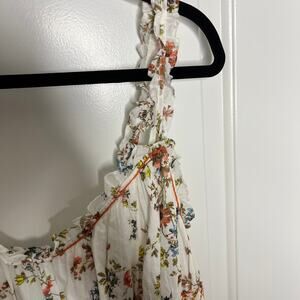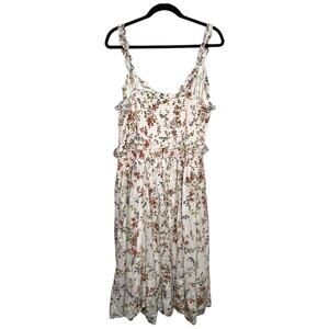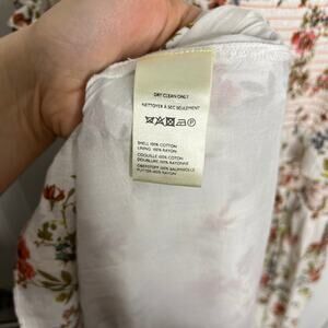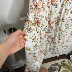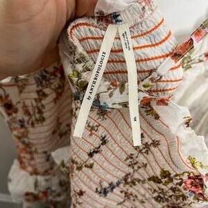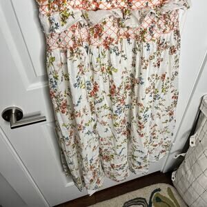 Elegant Anthropologie midi dress with floral design. Cream base with red accents. Ideal for any occasion.