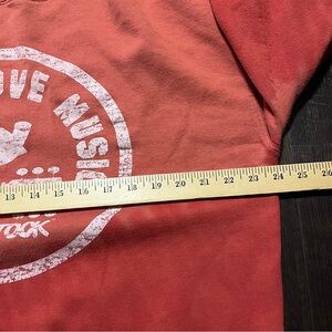 Red Woodstock sweatshirt with Peace Love Music graphic. Comfortable and stylish.