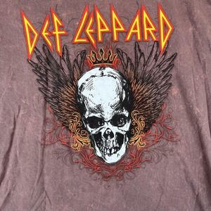 Features Def Leppard band logo in bold yellow and red font above a skull with wings and red/gold crown graphic on the front. No graphic on the back. Vintage brown tie-dye wash style throughout.