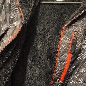 Stylish black and gray patterned jacket featuring red accents. Perfect for a trendy look. This jacket is 100% polyester with a faux fur inside lining for warmth and comfort.