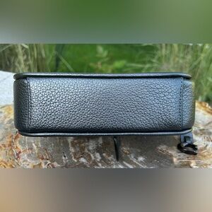 This stylish Pewter Metallic Polished Pebble Leather crossbody is a smaller bag, measuring 7 1/2” wide, 7” high and 2 1/4” deep with a 21 1/2” removable adjustable crossbody strap. While small however, this trendy crossbody can hold a large cell phone, a wallet, and keys with a little room to spare.