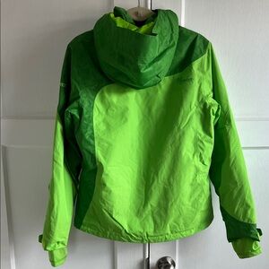 Vibrant green ski jacket by Marker. If this was a size 6, I’d keep it. I bought it because I loved the bright colors even though it’s too big. Easy to spot on crowded slopes. Great jacket. Hood fits over helmet. Powder skirt. Hand sleeves that fit into glove. Lots of pockets. Jacket is insulated, not a shell. Good preowned ski condition. Slight discoloring on hand sleeves. Nonsmoking dog friendly home.