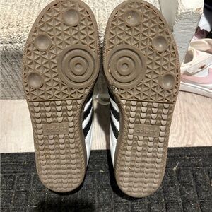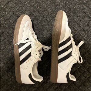 Classic Adidas sambas sneakers with black stripes. White leather upper. Durable gum sole. Worn once.