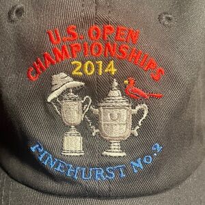 Black USGA cap commemorating the U.S. Open Championships in 2014 at Pinehurst No. 2. Features the event’s embroidered logo on the front and a USGA Member designation embroidered on the back. Unisex with a metal slide on the back strap that offers size flexibility. Please see photos for features.