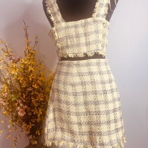 Elevate your wardrobe with this chic tweed skirt set. The cream and black pattern adds a touch of sophistication, perfect for any occasion.