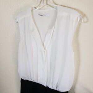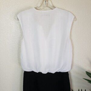 Elegant mini dress with a white top and black skirt. Sleeveless design. Perfect for any occasion.