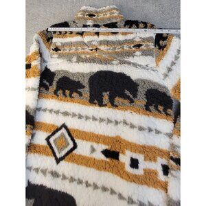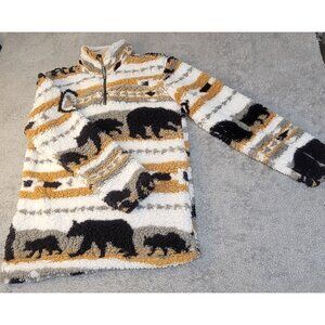 Cabin Fever by Ramatex Sherpa Pullover Bear Sweater. This is a sherpa pullover sweater, featuring a distinctive bear pattern with stripes. It is warm, super soft, comfortable, cozy, and bulky, yet surprisingly lightweight. It offers a 1/2 zipper closer at the neck, offering adjustable warmth and versatility. Size: Medium. Please see the provided photos for further details.