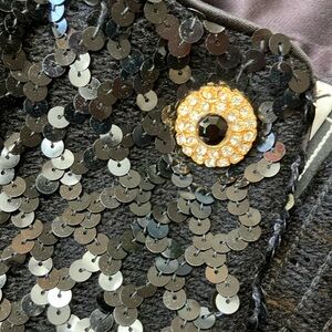 Neiman Marcus vintage black jacket/cardigan. All over sequins. Material has a little stretch- but smocking on the waist and wrists. Crew neck line. Buttons have sparkle and gold- but snaps underneath for easy use!