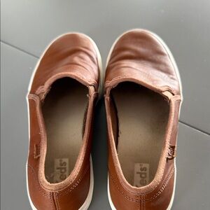 Elegant chestnut leather slip-ons with a sleek white sole. Ideal for everyday comfort. Good worn condition.