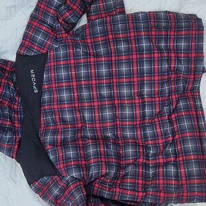 warm stylish plaid hooded jacket with a bold design. Features a mix of red, black, and white colors.