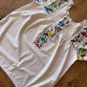 White top featuring vibrant floral embroidery in blue, pink, yellow, and green.