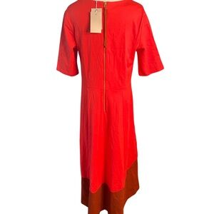 Stunning colorblock maxi dress by Boden, brand new with tags. Features a vibrant red bodice with a contrasting deep rust hem for a bold, modern look. The soft, mid-weight knit offers comfortable stretch, making it perfect for work, events, dinner, or everyday wear.