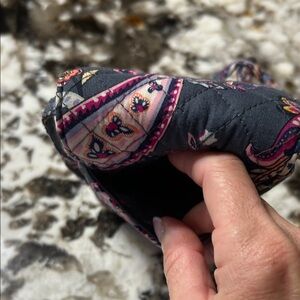 Stylish floral and paisley quilted crossbody bag phone holder by Vera Bradley with a vibrant design. Features a mix of pink and black colors. Compact size perfect for most phones. Small stain on the inside flap-see pictures.