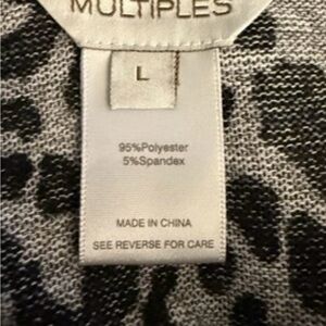 This Multiples Women's Animal Print Cowl Neck Sweater is a stylish and versatile addition to any wardrobe. With its 3/4 sleeves and cozy cowl neck, this sweater is perfect for casual occasions during the winter and fall seasons. Made from a blend of polyester and spandex, it offers a comfortable and flattering fit for women in size Large. The black and gray animal print adds a trendy touch to the classic pullover style, making it a standout piece for any outfit. Easy to care for with machine washable instructions, this sweater is a must-have for the fashion-forward woman. Length 29 in., Pit -Pit
