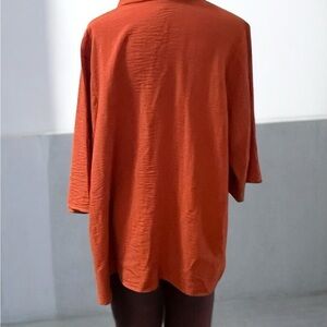 This vibrant orange top features a delightful Peter Pan collar and cuffed sleeves, offering a relaxed, oversized fit. Its button-down style and boxy silhouette make it a versatile addition to any wardrobe.
