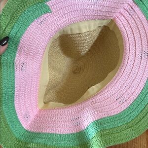 Stylish straw sun hat with pink and green stripes. Features black heart accents for a playful touch.