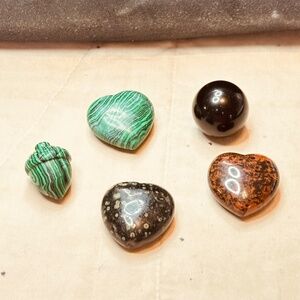 Lot of five crystals. Heart Crystals: Kambemba Jasper, Malachite & Mahogany Obsidian. Malachite Acorn & Black Onyx sphere. All genuine stones.