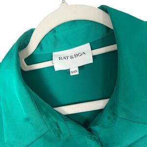 Turn heads in the Rat & Boa Alanis Dress in emerald green, women’s size XXS. This iconic style features a silky satin finish, collared neckline, button front, and a draped wrap silhouette with a tie at the hip. The vibrant emerald tone is both bold and sophisticated, making it the perfect blend of old money elegance, coquette charm, and Y2K glam. Effortlessly sultry yet chic, this dress is made for parties, cocktails, or any standout night-out look.