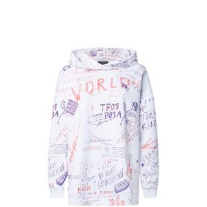 Stylish hoodie with colorful graphic prints. Features a comfortable fit and a hood.