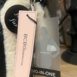 Elegant BCBG shoulder bag with faux fur trim. Black center with cream accents. Perfect for adding sophistication to any outfit.