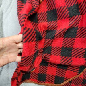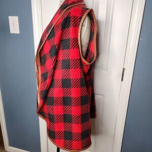 Versatile fleece vest designed for comfortable layering, featuring a classic buffalo check pattern in bold red and black. Crafted with soft material and trimmed with leather-like edging, this piece offers warmth and style for outdoor enthusiasts and fashion-conscious individuals.