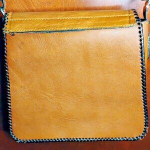 This is a medium-sized, hand-made, custom Western-themed shoulder bag for women. It is extremely unique, try and find another like it as it's hand made. It features an animal print design, brown faux leather exterior, black fabric lining, magnetic button closure, silver hardware, and brown faux leather straps. The bag has a folding feature and measures 10 inches in width, 9 inches in height, and 4 inches in depth.