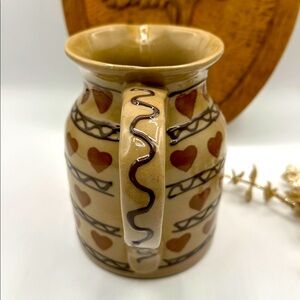 This is an adorable, heart decorated stoneware Pitcher. HartStone was a company that made pottery in Ohio. It is no longer in business, but their teapots and Pitchers are beautiful. This Pitcher is in a light brown and decorated with dark brown trim and hearts. No chips or cracks, in beautiful condition. Very glossy and shiny. Holds approximately 28 ounces and is 6 inches tall.
