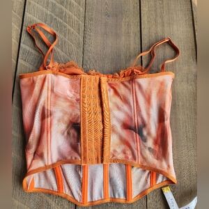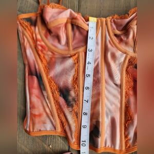 Stylish corset top with orange and black design. Features lace details and adjustable straps.