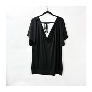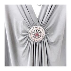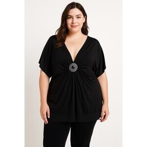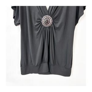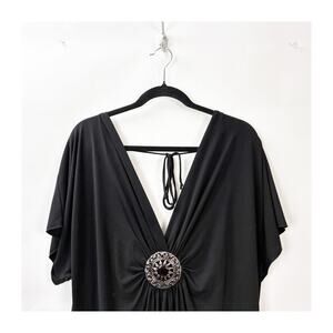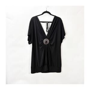 • Draped black stretch top with deep V‑neck and oversized medallion brooch accent at the front, tie at back of neck