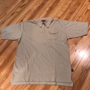 StoraEnso tan fine knit shirt sleeve polo shirt. 3 button center front placket. Left chest button flap pocket with embroidered accent lines. High-low hem with sideseam slits. 100% cotton. Size XL. New, no tags. Nonsmoking home.
